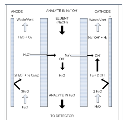Electrolyte Suppressor는 전기화학적 억제(Electrolytic Suppression) 방식을 이용합니다. 내부의 이온교환막과 전극 셀이 인가된 전류를 받아 작동하며, 이동상에 존재하는 Na⁺, K⁺, CO₃²⁻ 등의 전해질 이온을 물(H₂O)이나 약전해질로 변환합니다. 이 과정에서 검출기에 도달하는 배경 신호가 거의 0에 가까워지고, 시료의 이온 성분만이 명확히 구분되어 나타납니다.