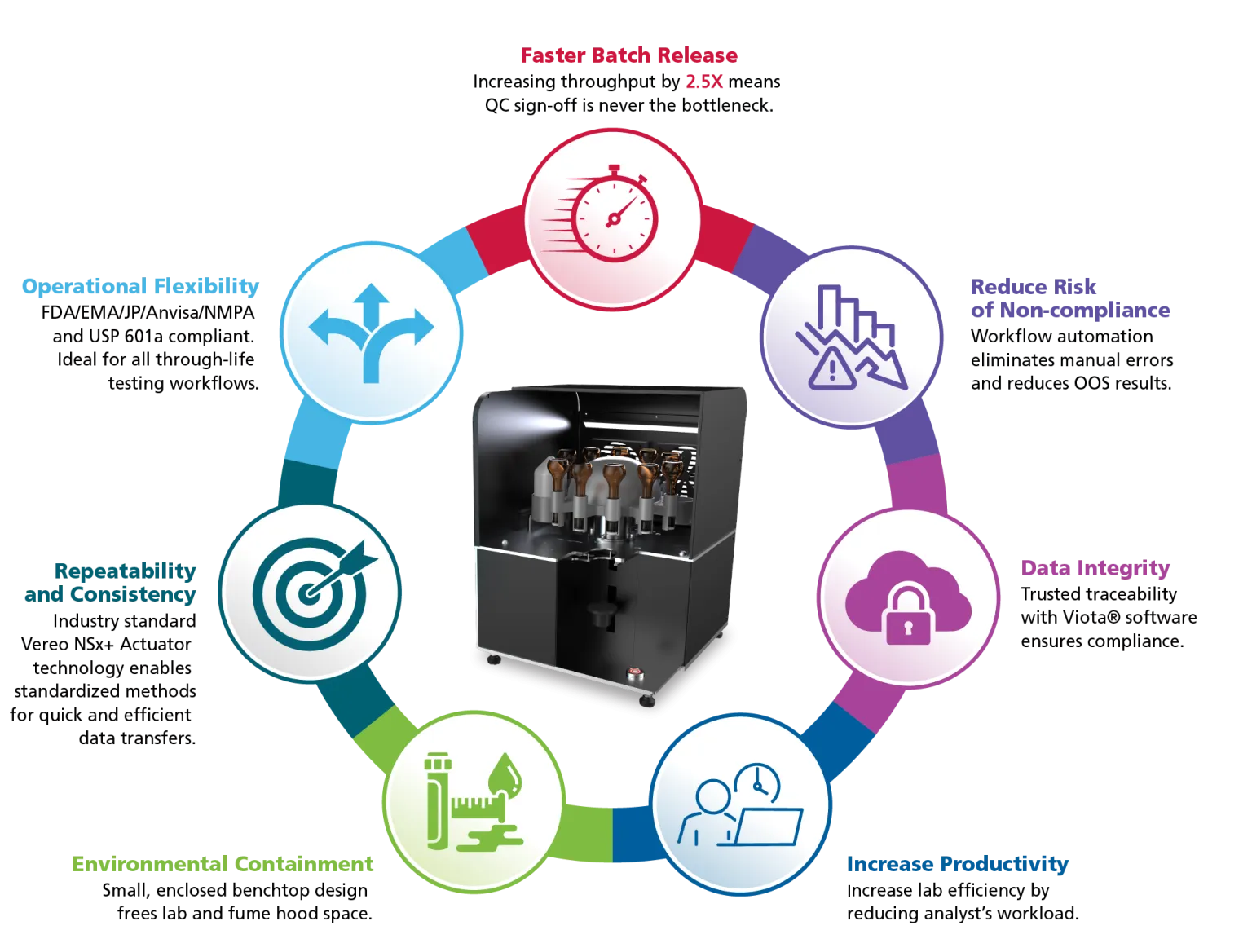 | 신뢰성 및 규제 준수 | Viotra® 소프트웨어를 통한 데이터 무결성 및 규정 준수 | 데이터 신뢰성을 보장하고, 규제 비준수(Non-compliance) 위험을 줄입니다 (FDA, EMA, JP, USP 601a 등) |